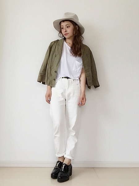 カーキのジャケットがアクセントになります。ホワイトとの相性抜群!