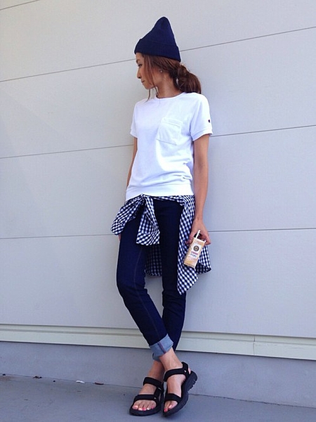 スポサンにチェックシャツでボーイッシュさを取り入れて。