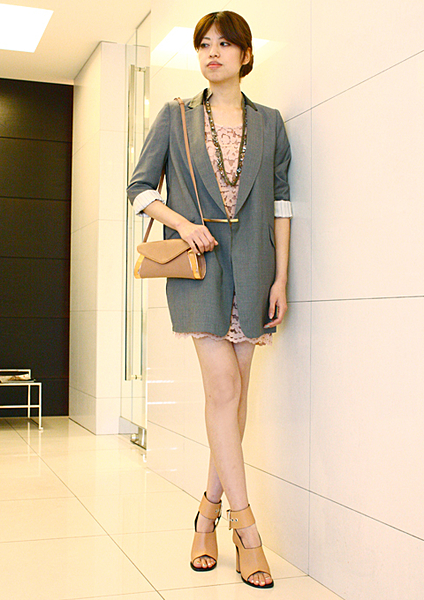 合わせる小物で、甘口にも辛口にも変身するのが魅力。