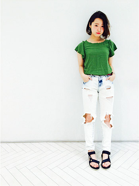鮮やかなグリーンがかわいいコーディネート。ボトムスにダメージデニムをもってくることでカジュアルにもなるんです♡