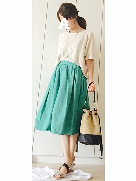シルエットがきれいな膝丈スカート。お上品にコーディネートが仕上がるので、ママ友とのランチなどにも大活躍◎