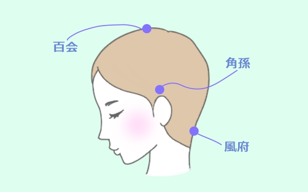 耳の上の髪の生え際あたり、少しくぼみを感じる部分が、角孫の目安です。頭部の緊張をほぐし、血行を促すといわれています。