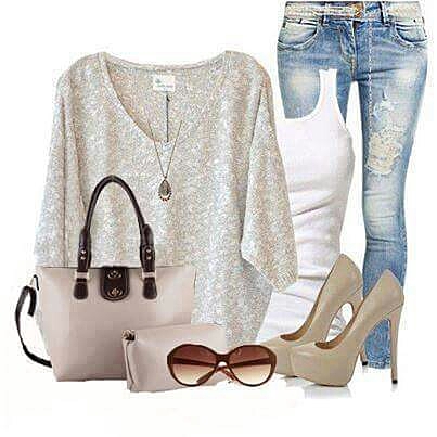 バッグ、Yシャツ、ヒールをベージュで合わせることによってまとまったコーデに