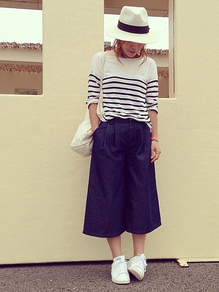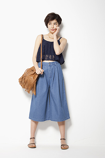トレンドのガウチョパンツとビスチェを合わせ、爽やかな印象の大人カジュアルコーディネート