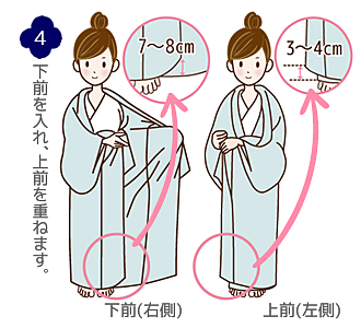 2. 「上前」を上から重ねます。このとき、3〜4cm裾先を上げると綺麗に着付けられます。