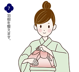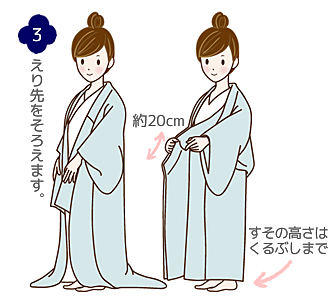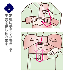 浴衣は両側から腕を通すことが出来るので、ふところから腕をいれて、「おはしょり」を整えます。