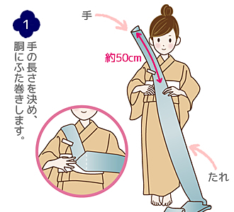 1. 帯を半分に折って肩にかけ、50cmくらいのところで、◀︎をつくります。