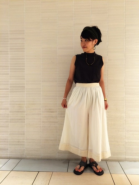 ウエストゴム仕様で軽い素材で作られたドレープガウチョパンツです。裾が広がっていて、はきやすい七分丈。スカートのような、ボリュームがあるシルエットです。