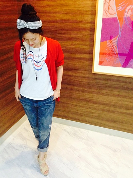 一見シンプルに見えるコーデだけど、デニムのサイドがフリンジになっていたり、キャッチーなおじさんのプリントTシャツが遊び心溢れてる♡