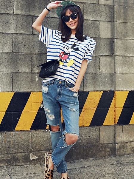 みんな大好きなミッキーのプリントTシャツはダメージデニムと合わせてボーイッシュに着こなして♡