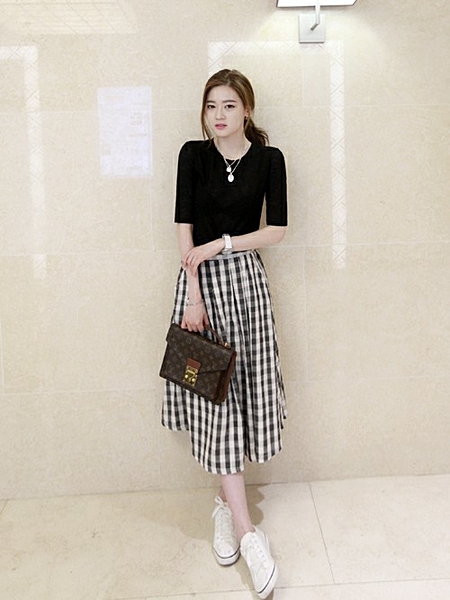 ギンガムチェックのミモレ丈スカートはグレーTシャツで大人っぽく♡