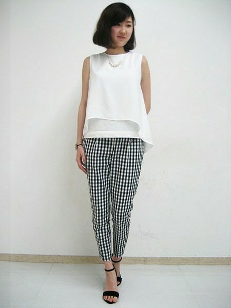 オフィスにも使える白のブラウスとギンガムチェックのパンツの相性は抜群♡