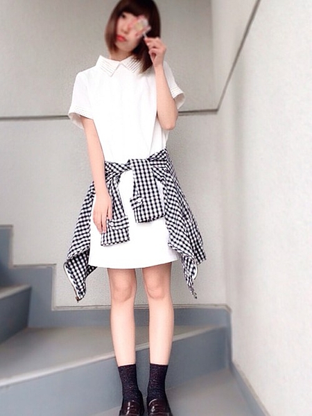 シンプル白ワンピにギンガムチェックのシャツがポイントに*