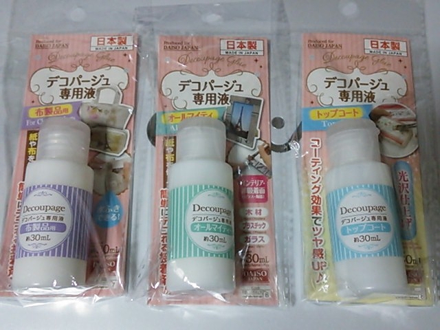 なんと100円ショップでもデコパージュ用の専用の液が手に入っちゃうんです♭お手軽にかわいくできちゃいます*