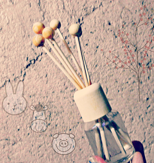■フレグランスオイルを入れたビンに、スティックを挿していく