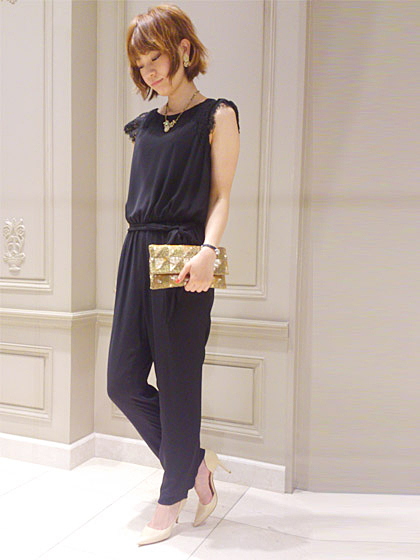 胸元のレース切り替えデザインがオケージョンにも使えるオールインワン。ウエストのペプラムシルエットがポイントです。落ち感のあるとろみのある素材で1枚で上品な印象に。
