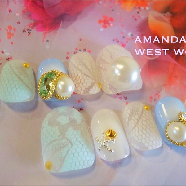 お客様オーダーネイルご紹介。水晶ネイル♪ 白を使っておまかせで!とのことでレースのスタンピングにグラデーションベースの上にパールや本物の水晶のさざれ石を乗せて綺麗目に(。-ω-。) http://t.co/8xah0E3kAn