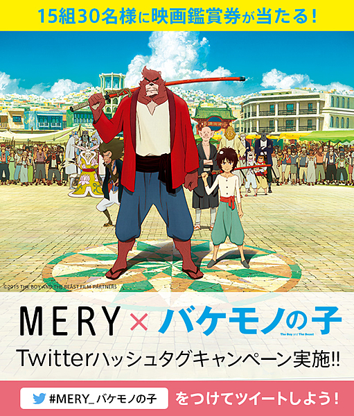 2015年7月11日公開の、細田守監督の最新作映画「バケモノの子」とMERYがコラボレーション!抽選で15組30名様に映画鑑賞券が当たるキャンペーンを実施します。Twitterで「#MERY_バケモノの子」とつぶやいて映画鑑賞券をGETしちゃいましょう♪