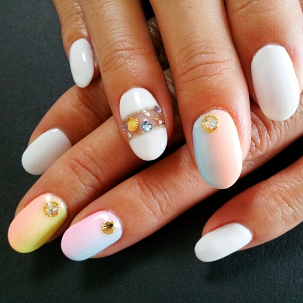 レインボーカラーで夏らしく元気に仕上げたネイルです☆シンプルにメタルシェルとスタッズで仕上げたところも控えめでお色を引き立てます♪ http://t.co/bwoP9EtpW8 http://t.co/KenrwIVjYc