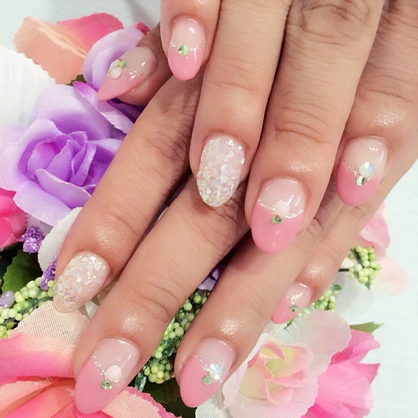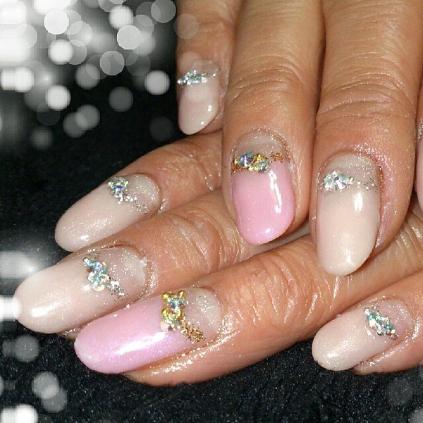 定額コース¥3300クーポン使用で¥2500 パステルピンクで逆フレンチ☆そしてピンクのラメを散らして、とてもかわいくなりました http://t.co/GsXALRgOux