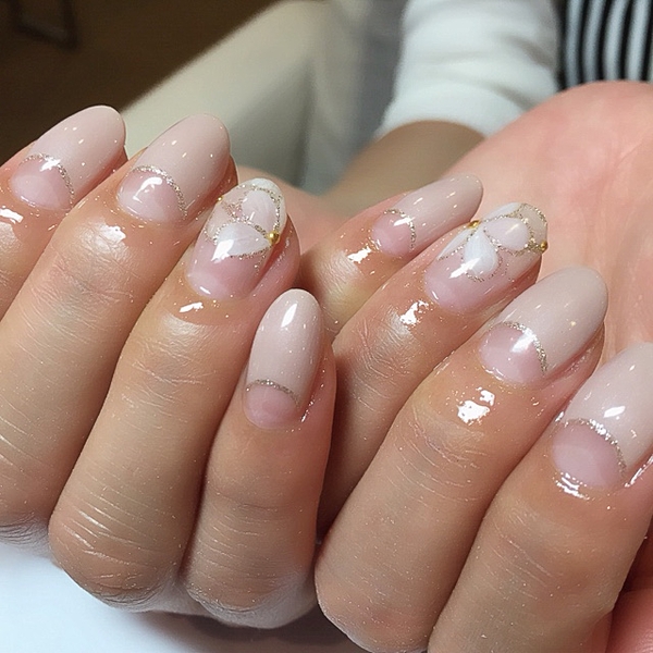 ベージュの逆フレンチに、お花のアートが印象的なネイル。