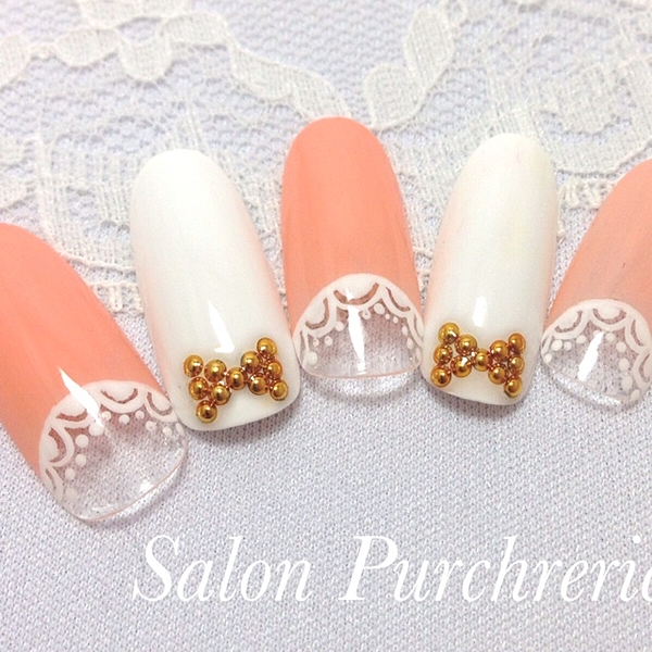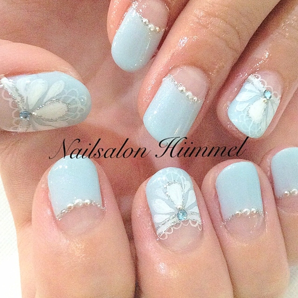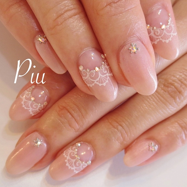 ¥8900 淡いピンクの逆フレンチに白のレース柄とストーンで華やかさPLUS!! ブライダルネイルにも最適です☆ HP http://t.co/Ds9O8LcPCh http://t.co/zR5aKPYzs6