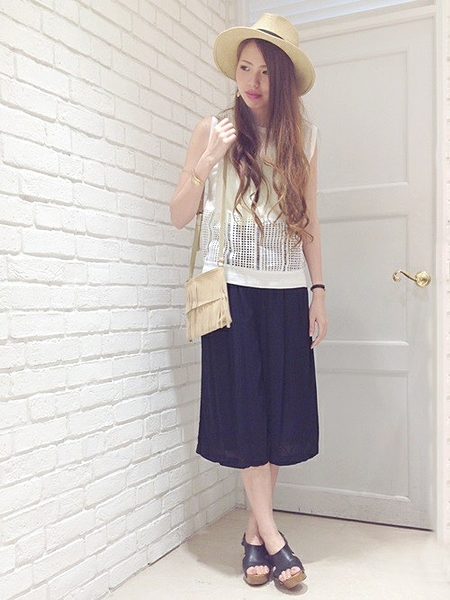 ホワイトのガウチョパンツで