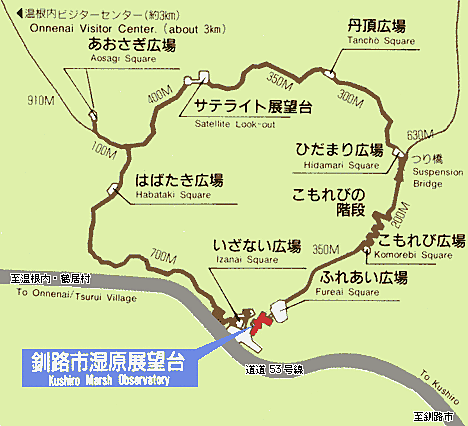 湿原展望台の周囲2.5kmを約1時間で回る遊歩道は7ヶ所の広場とサテライト展望台からなっており、温根内ビジターセンターと北斗遺跡へ通じています。周辺にはエゾカオジロトンボやキタサンショウウオなどが生息します。