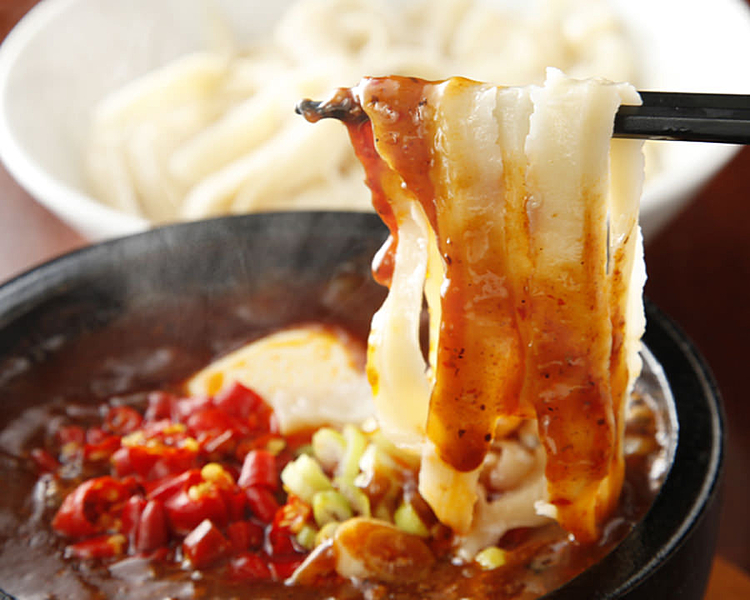 ピリ辛の麻婆ともっちもちの平たい麺の組み合わせがたまりません...!
