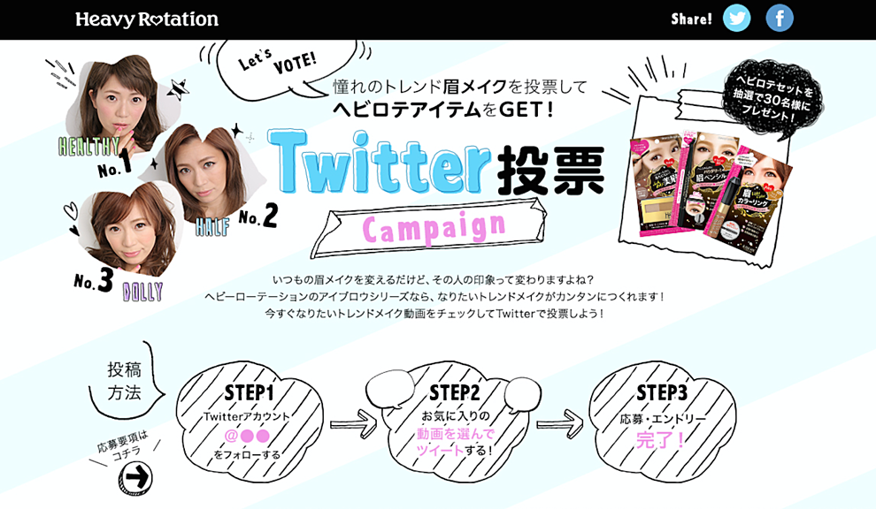 口コミで大人気のメイクブランド、HeavyRotation(ヘビーローテーション)では、Twitterをつかって好きな眉メイクに投票するだけで、動画に出てきたメイクアイテムのセットがあたるキャンペーンを実施中!