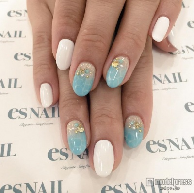 定番カラーのブルー×ホワイトはクリアなグラデーションにすることでオシャレ度アップ。ブルー系ストーンやスタッズ使いがアクセントに効いていますね。