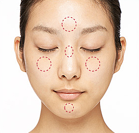 そして、頬、眉の間の上、鼻の頭、あごの5点につけます♭