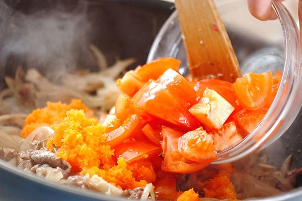 2、フライパンに残りのオリーブ油を入れて牛肉を色が変わるまで炒め、(1)の玉ネギとマイタケを戻し入れる。小麦粉を加えて全体に炒め合わせ、粉っぽさがなくなり、しっとりしたらニンジン、トマトを加えて炒め合わせる。