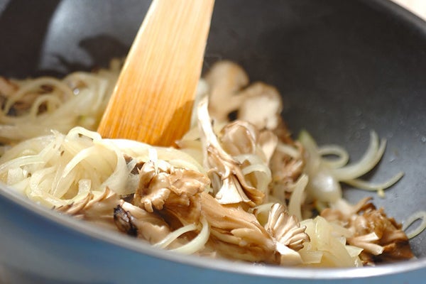 1、大きめのフライパン、または中華鍋にオリーブ油大さじ1を強火で熱して玉ネギがしんなりするまで炒め、マイタケを炒め合わせていったん取り出す。