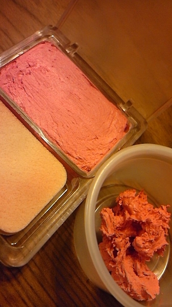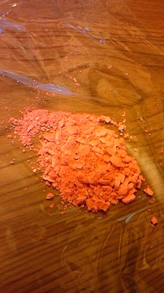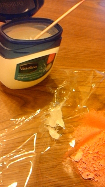 ヴァセリンをラップの上に出し、粉チークと混ぜます。