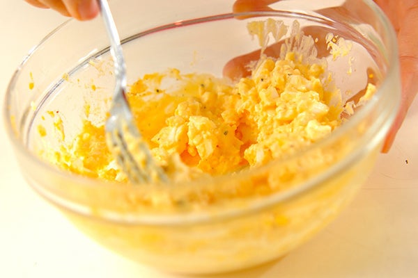 2、ゆで卵は殻をむき、フォークで粗くつぶして<調味料>の材料を加え、混ぜ合わせる。