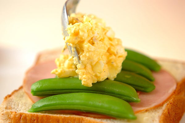 3、胚芽食パン1枚の片面にバターを、もう1枚の片面に練りからしをぬり、ハム、スナップエンドウをのせ、その上に(2)をのせてサンドし、半分に切る。
