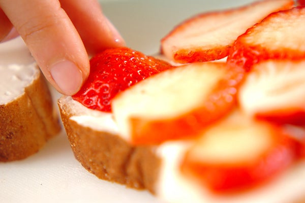 5、マスカルポーネチーズとハチミツ、バニラエッセンスを混ぜ合わせ、胚芽食パン2枚にぬり、イチゴを並べてサンドし、半分に切る。