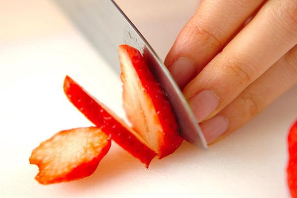 4、<イチゴサンド>を作る。イチゴは洗ってヘタを切り落とし、縦4等分に切る。