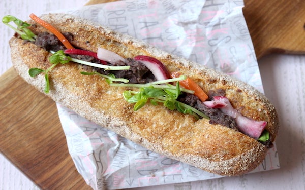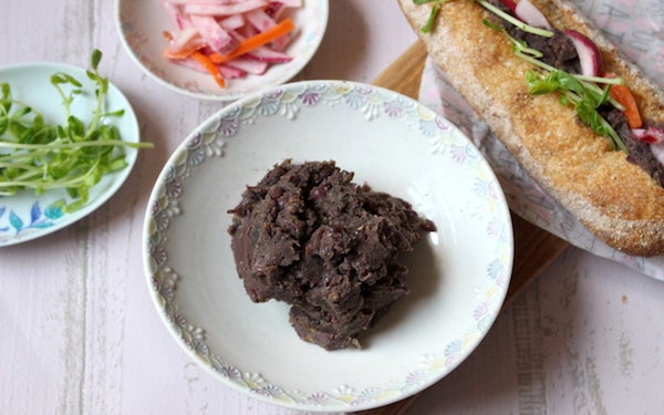 「万能小豆ペースト」をバケットにはさめば、レバーペースト風のバインミーのできあがり! 今回は野菜のマリネと豆苗を加えましたが、お好みでパクチーなどを加えればアジアンテイストが楽しめますよ。