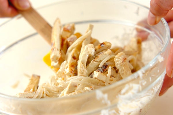3、<ドレッシング>のボウルに(1)と(2)を入れ、よく混ぜ合わせる。器に盛り、刻みネギを散らす。