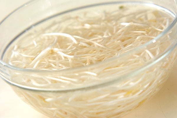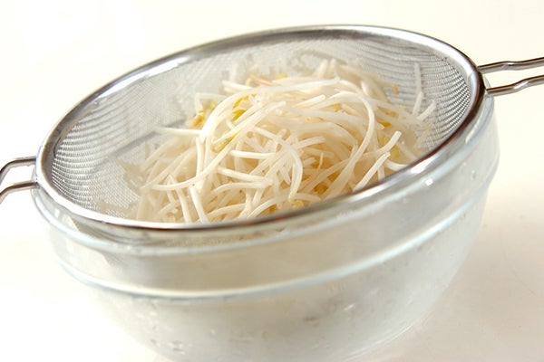 ・モヤシはたっぷりの水に放ち、パリッとしたらザルに上げ、水気をきる。