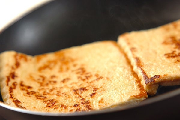 2、フライパンに油揚げを入れ、弱めの中火で両面こんがりと焼き、縦半分に切ってさらに幅5mmに切る。