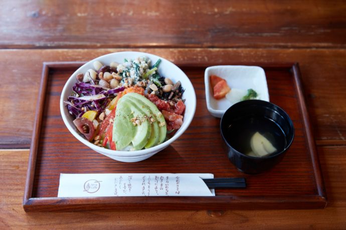 レタスやアボガド、トマトなどの他、ひじき煮や白和え、豆類など全10種類の野菜やタンパク質が豊富な食材が入ったサラダボウル。麦飯と香の物、汁物がついて950円(税別)