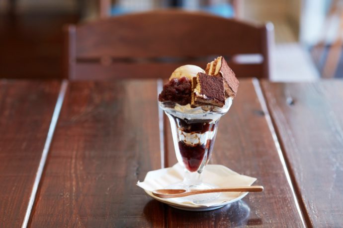 黒糖ゼリーに黒蜜アイス、小倉粒あん、生クリームを使ったパフェの上に、ティラミスが乗った和と洋のマリアージュが絶妙なスイーツ、750円(税別)。