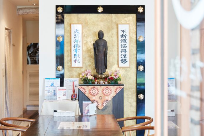 ここ数年、お寺や僧侶が注目を浴び、関連本や僧侶が登場するテレビのバラエティ番組などが人気となっています。「寺カフェ 代官山」は、より身近にお寺や僧侶に親しんでもらえる場所としてオープン。このカフェを運営するのは、川崎市にある浄土真宗本願寺派の信行寺。毎日、交代で本職の僧侶が常駐し、訪れた人はお茶や食事を楽しみながら、悩みを相談することができるのです。