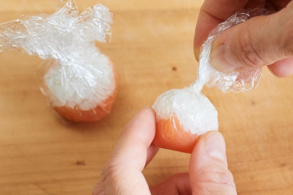 5、ラップを絞って形を丸く整える。
