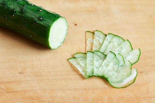 3、きゅうりを半月切りに薄くスライスして、うろこを作る。