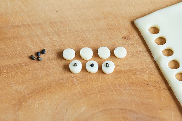 2、丸く抜いた白目部分に黒ごまを乗せ、目を作る。