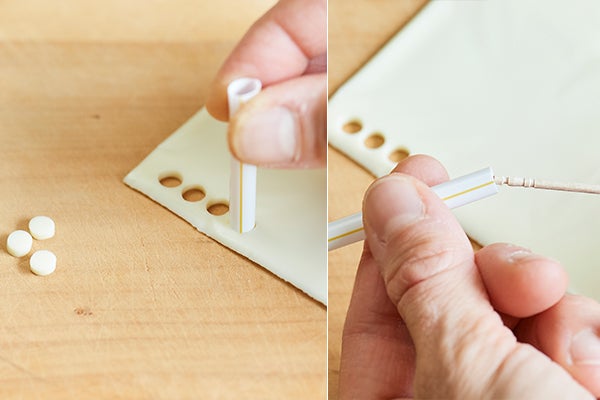1、スライスチーズをストローで丸く抜く。この時、爪楊枝の後ろを使うとチーズをストローから外しやすい。